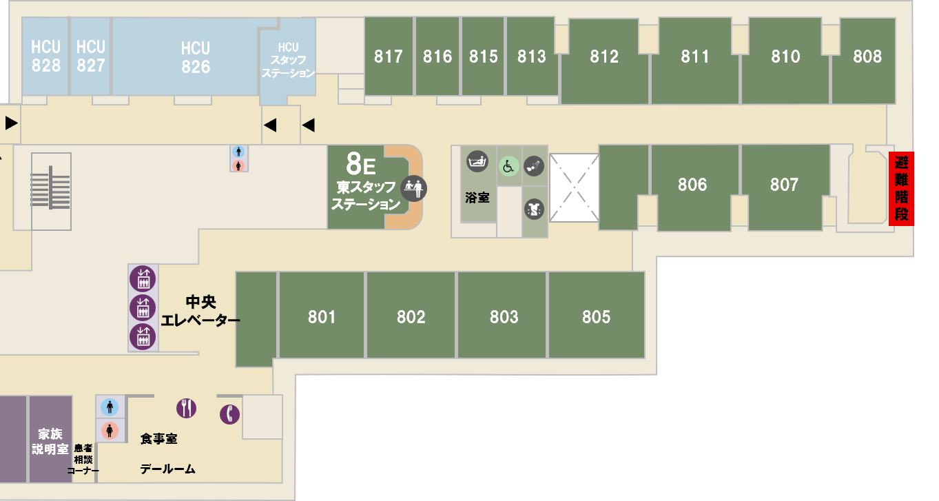 8階東 | 8階西 | 病棟(消化器内科、外科)、高度治療部(HCU) 家族説明室、お薬指導室 など |